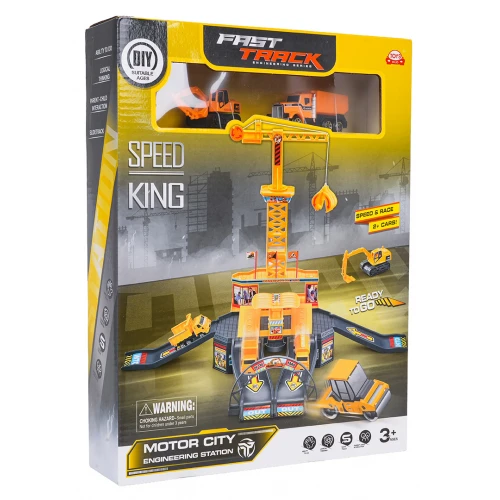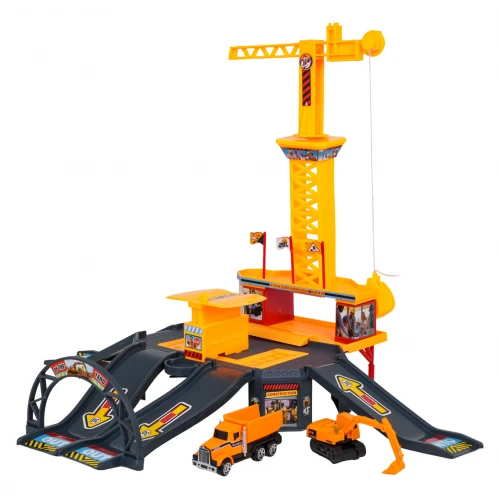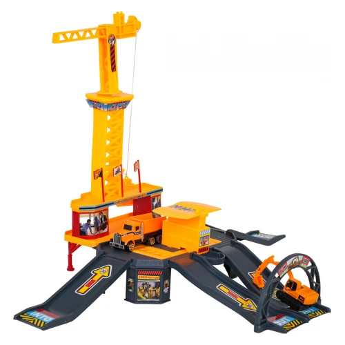 W skład zestawu wchodzi konstrukcja placu budowy z licznymi zjeżdżalniami, pojazdy budowlane, w tym ciężarówka z metalową kabiną i podnoszoną przyczepą, a także dźwig z ruchomą łyżką i chwytakiem obsługiwanym manualnie.