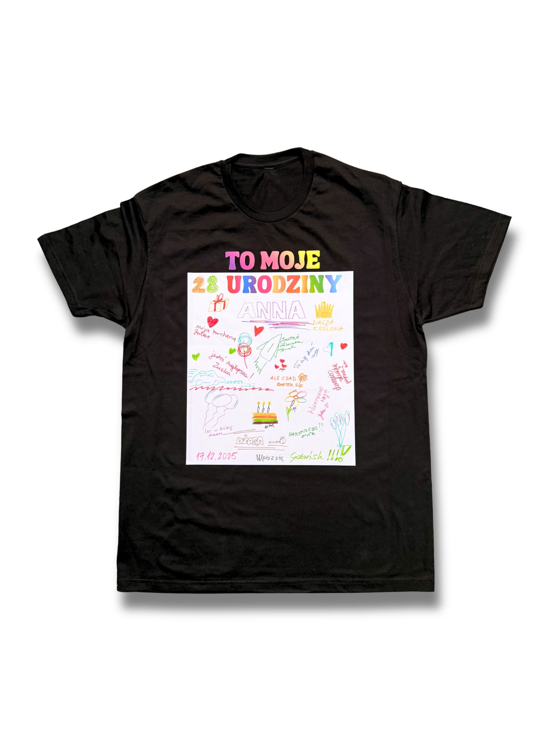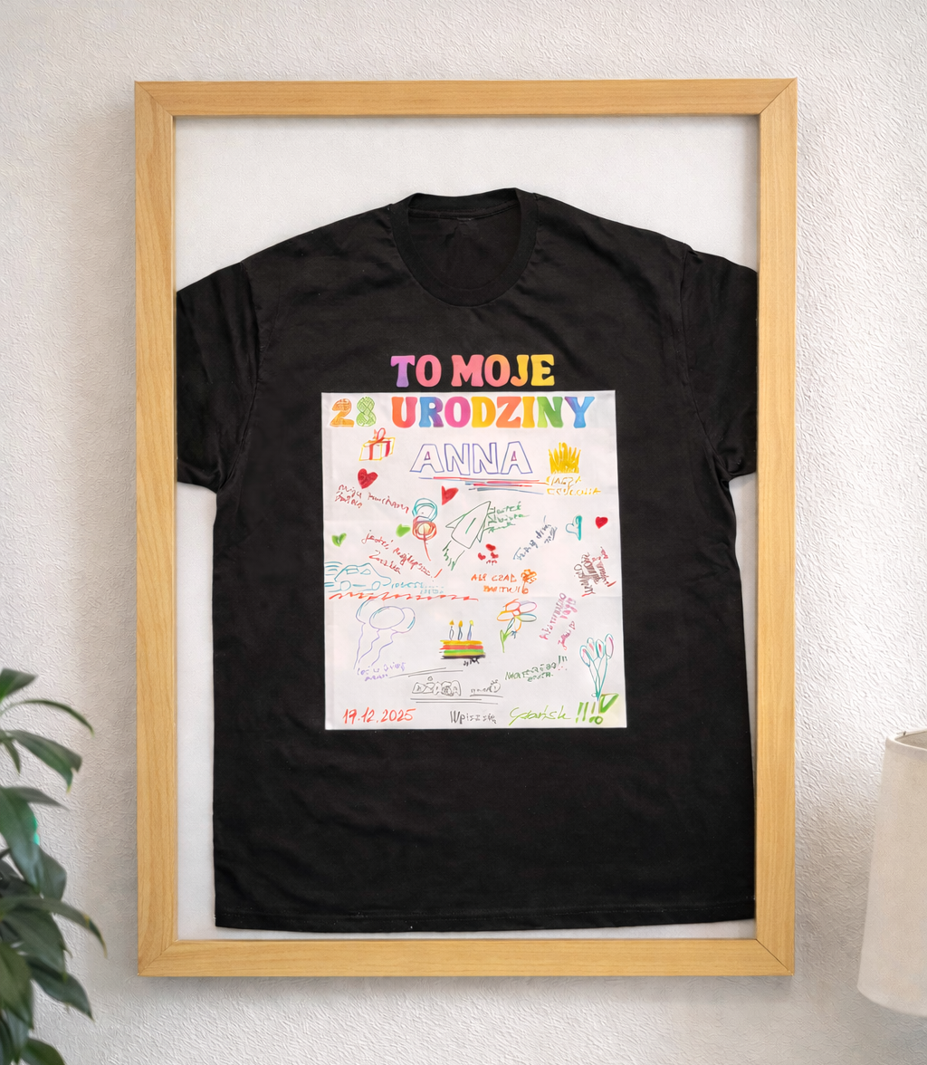 Zrób prezent sobie lub komuś bliskiemu. Koszulka nadaje się na każde urodziny, niekoniecznie okrągłe. Może być zarówno dla znajomych jak i dla rodziny. Możesz też zaszaleć i poprosić o wpisy nieznajomych 🙂