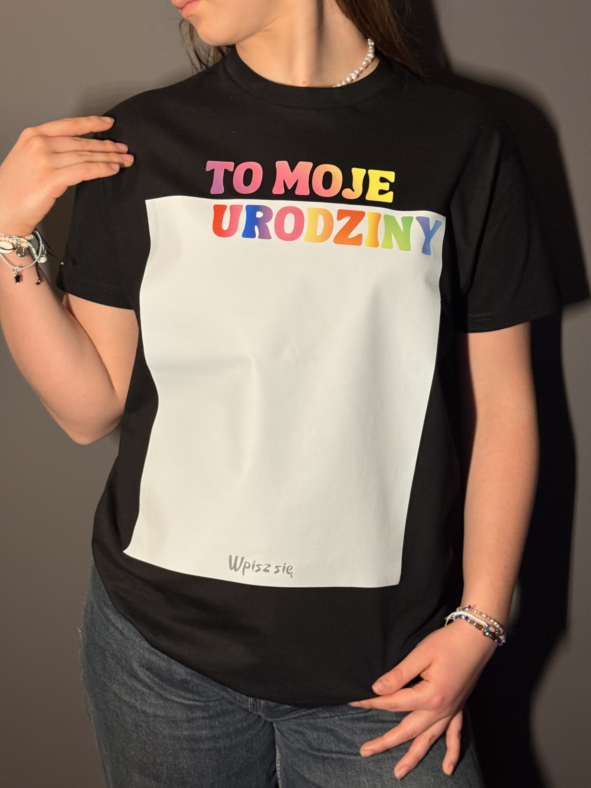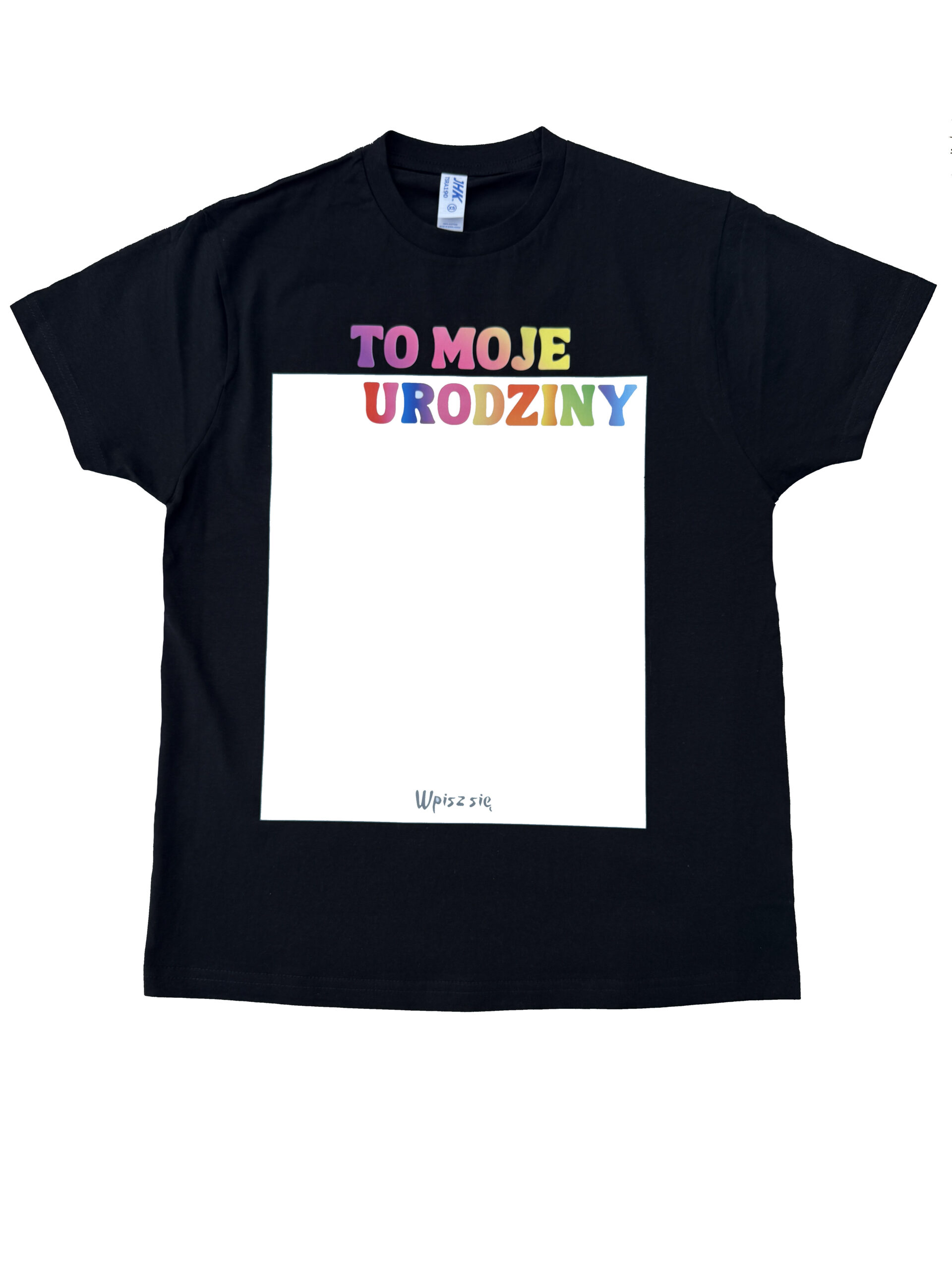 Koszulka jest w kolorze czarnym z kolorowymi napisami i białym polem na przodzie na wpisy gości ✨ Z tyłu koszulka nie posiada nadruku.